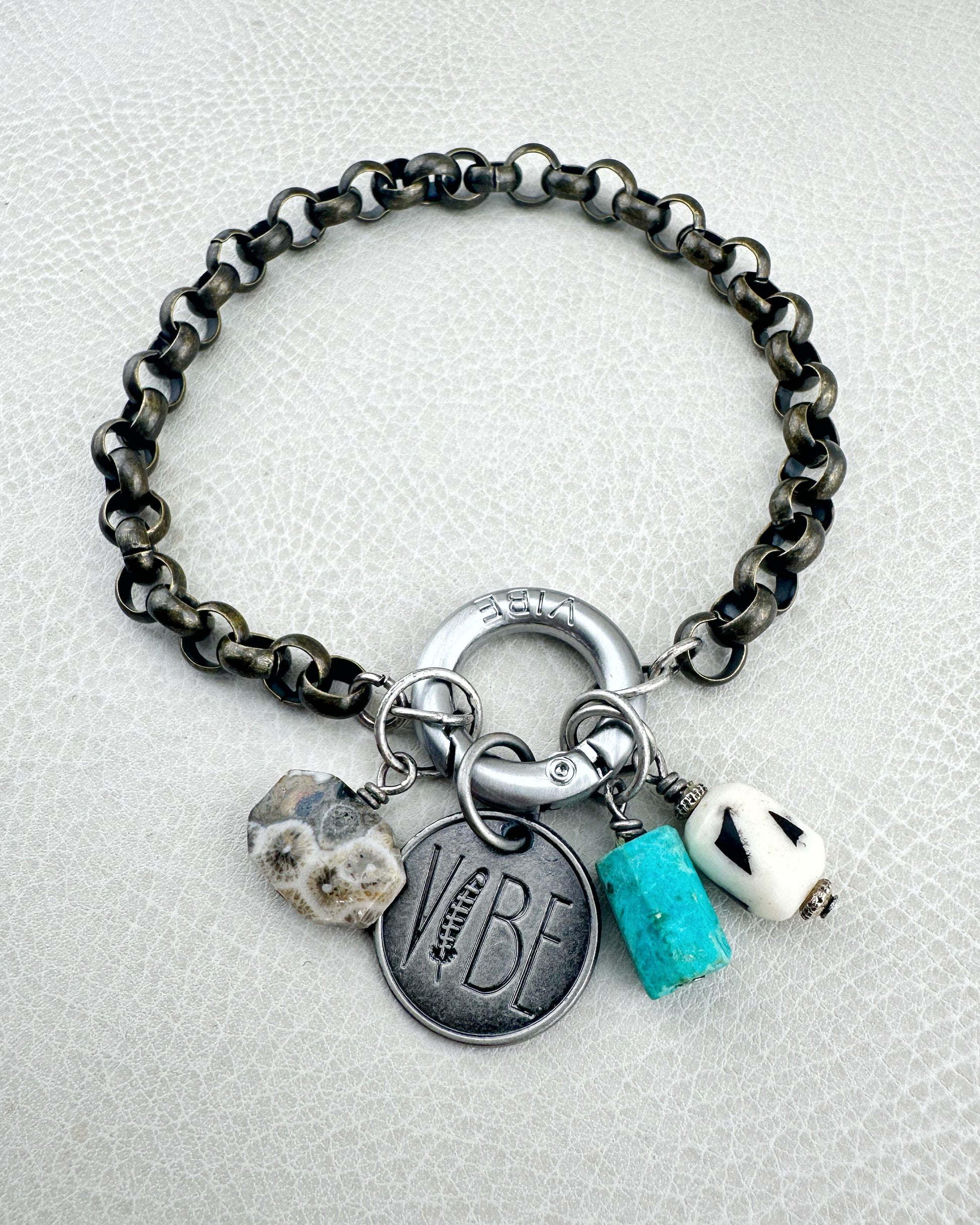 Finished with a chunky bronze rolo chain and a vibe link clasp for that perfectly earthy, boho statement feel.
