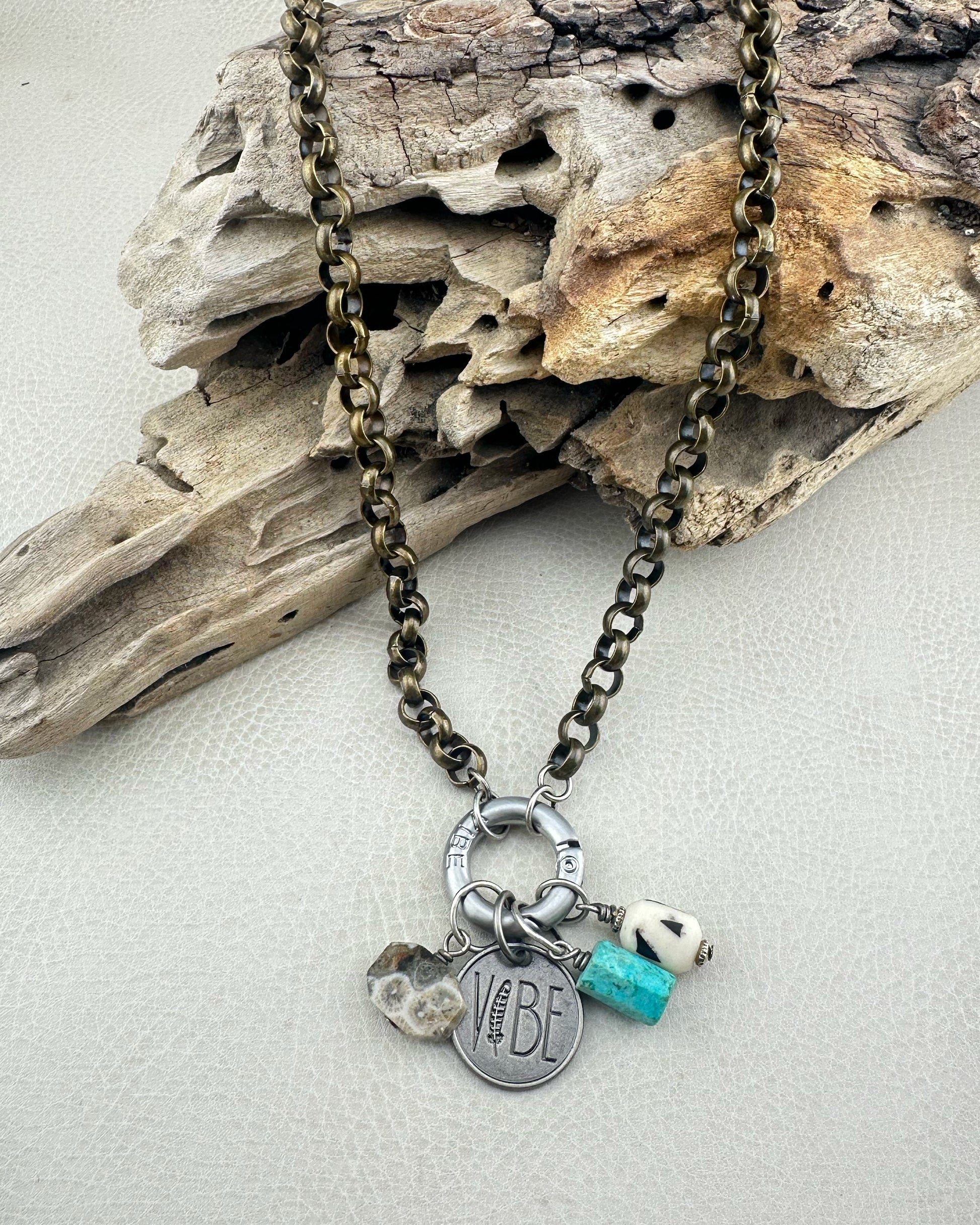 Finished with a chunky bronze rolo chain and a vibe link clasp for that perfectly earthy, boho statement feel.