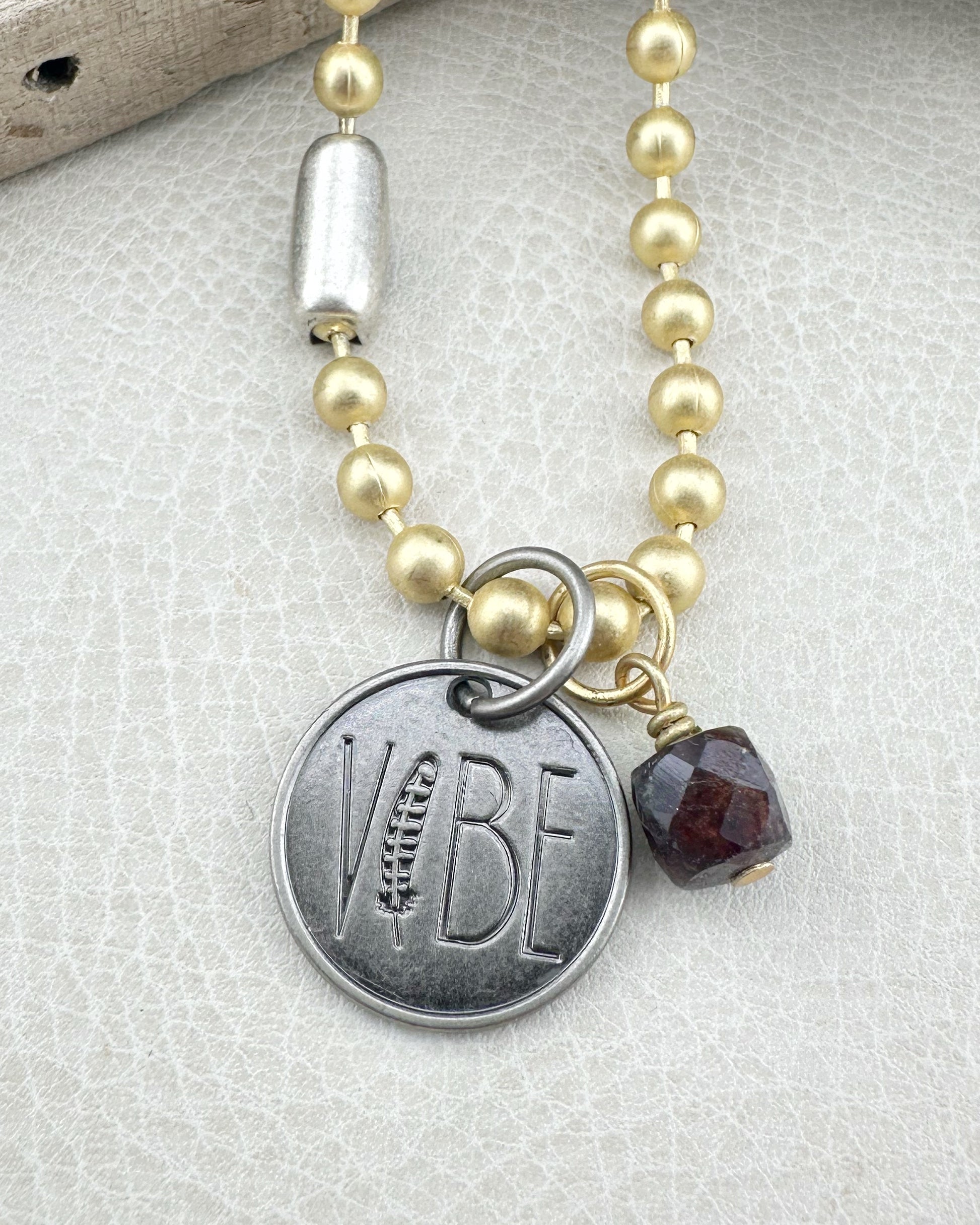 Meet True North — the mainstay necklace you’ll reach for every day. Featuring your favorite 6mm ball chain in matte gold or antique silver, a subtle VIBE charm, and a delicate faceted garnet cube, this piece is all about grounding, clarity, and timeless style.